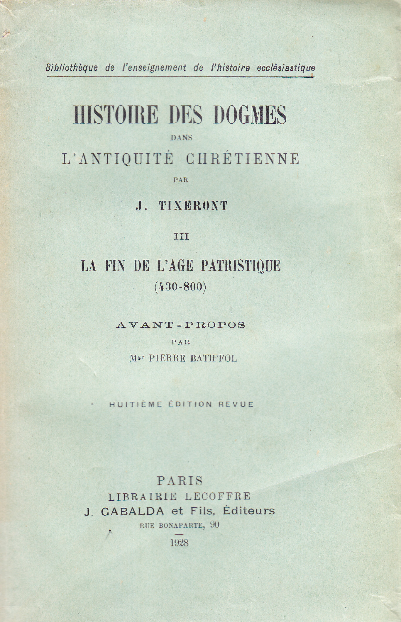 TITOLO/DENOMINAZIONE: Histoire des dogmes dans l'antiquité chrétienne III. La fin de l'âge patristique (430-800)