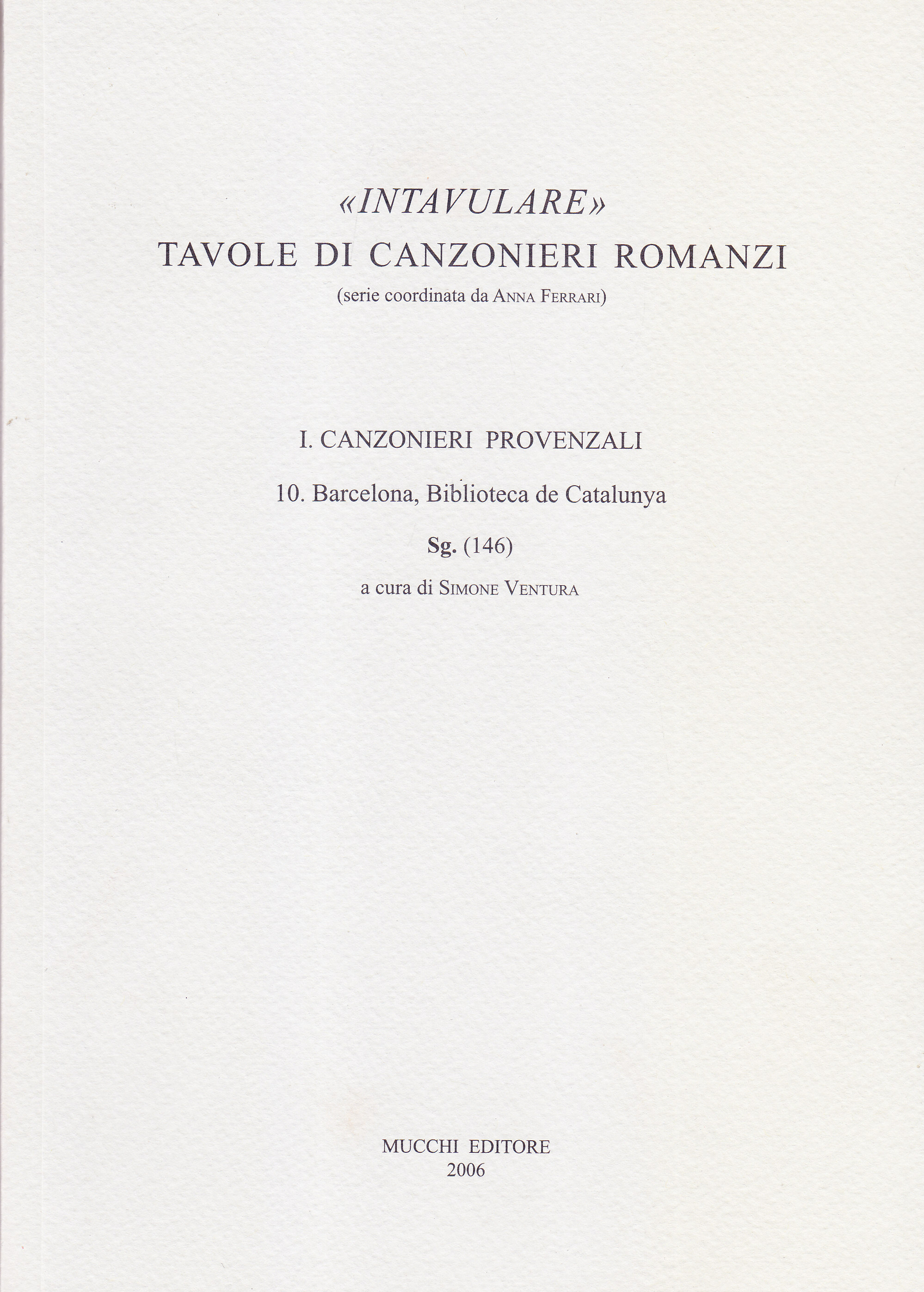 "Intavulare". Tavole di canzonieri romanzi I. Canzonieri provenzali 10. Barcelona, Biblioteca de Catalunya Sg. (146)