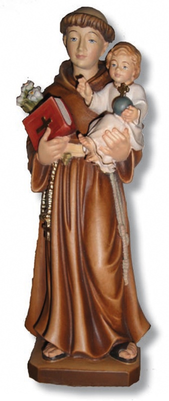 Commento dell'editore: Statua di Sant'Antonio dipinta con colori a pastello in legno della Val Gardena (Ortisei) su piedistallo.
