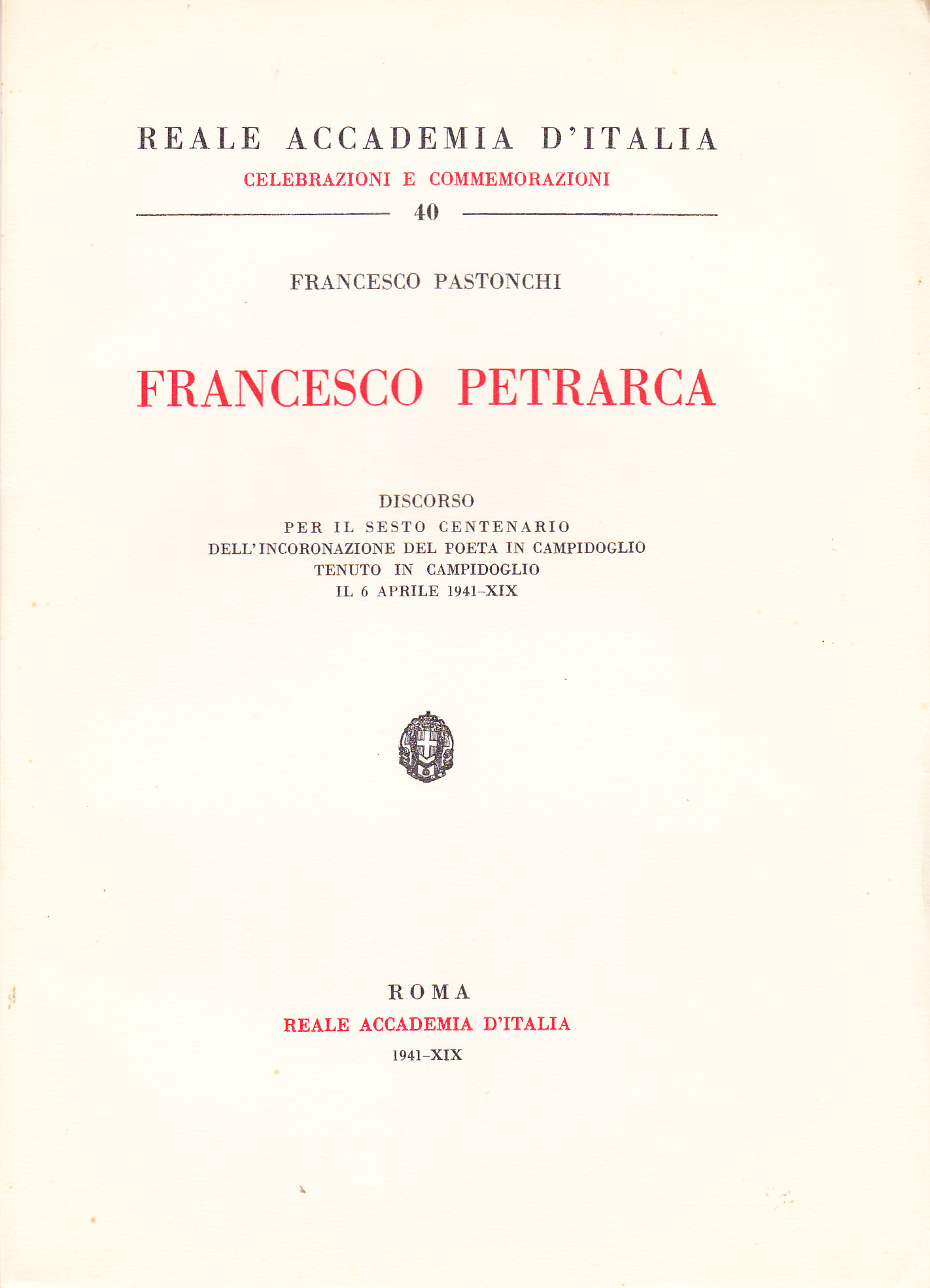 Discorso per il sesto centenario dell'incoronazione del poeta in Campidoglio tenuto in Campidoglio il 6 aprile 1941-XIX