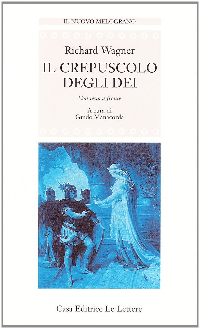 Terza e conclusiva giornata dell'Anello del Nibelungo, Il crepuscolo degli Dei conclude nel segno della fine universale la grande costruzione drammatica deIla Tetralogia wagneriana. Le tre Norne (le Parche della mitologia nordica) hanno visto spezzarsi il filo dei destino e, nel crepuscolo che ormai li avvolge, tutti i protagonisti - dèi, demoni ed eroi - appaiono come un pallido riflesso di ciò che furono. Nella desolata sede del Walhalla, ormai semivuota, Wotan prepara l'ultima distruzione; Sigfrido è trascinato a tradire Brünnhilde da un filtro magico che svuota la sua essenza di eroe e muore colpito nell'unico punto vulnerabile svelato dalla stessa walchiria, anch'essa tratta in inganno; perfino le creature malvagie sembrano aver perso la loro sinistra grandiosità. L'ultimo sussulto di grandezza è quello della fine, nel duplice incendio che brucia il cadavere di Sigfrido, sulla cui pira si precipita Brünnhilde, e il Walhalla, mentre il mondo si dissolve nel trionfo delle forze primigenie: il fuoco e l'acqua che dal Reno sale a riprendersi l'anello forgiato con l'oro trafugato. Il testo wagneriano viene riproposto nella classica versione italiana di Guido Manacorda, ancora insuperata per esiti interpretativi e formali. L'ampio corredo di note fornisce - oltre a una puntuale spiegazione del rapporto tra la musica e le parole - tutti gli indispensabili riferimenti linguistici, letterari e filosofici.