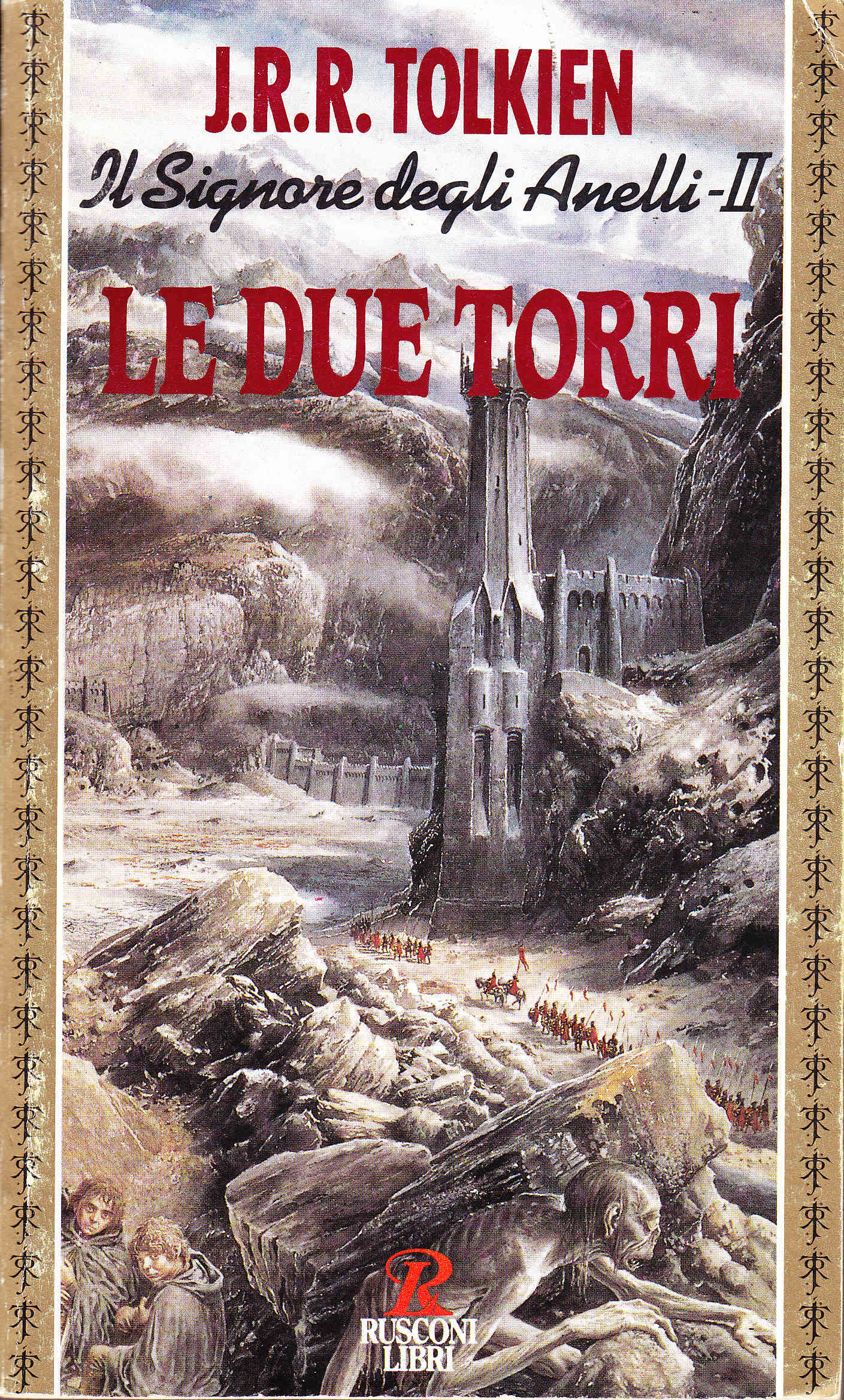In questo secondo romanzo, Le due Torri, gli amici della Compagnia lottano separati. Merry e Pipino sono fatti prigionieri dalle forze del Male, ma riescono a fuggire, e trovano soccorso in uno strano mondo di esseri giganteschi, mezzo vegetali e mezzo umani; è un episodio in cui il comico e il patetico, fusi insieme, toccano il sublime. Aragorn, un enigmatico personaggio che si era unito alla Compagnia all'inizio dell'impresa, stringe allenaza con i guerrieri di Rohan, un popolo fiero e luminoso come l'argento di cui si veste, che per secoli ha resistito all'assalto delle tenebre. Frattanto Frodo e il devoto Sam s'imbattono in Gollum, un viscido essere che era stato l'antico possessore dell'Anello, e lo costringono, recalcitrante, a condurli verso Monte Fato. Ma spaventose creature li attendono al varco e il loro cammino si interrompe tragicamente ancora una volta.