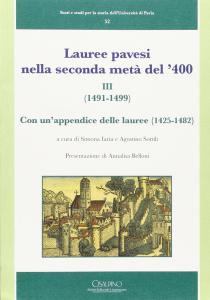 Il terzo volume delle lauree pavesi, giungendo fino al 1499, completa il quadro degli studenti e dei docenti dell'Università di Pavia del secondo Quattrocento, delineato nei primi due volumi ad esso dedicati (nn. 25 e 29). L'indagine, avviata da Agostino Sottili e portata scrupolosamente a compimento da Simona Iaria, arricchisce le conoscenze già disponibili relative al primo e secondo Quattrocento, grazie anche alla pubblicazione di un insieme di lauree contenute in un fascicolo emerso di recente.