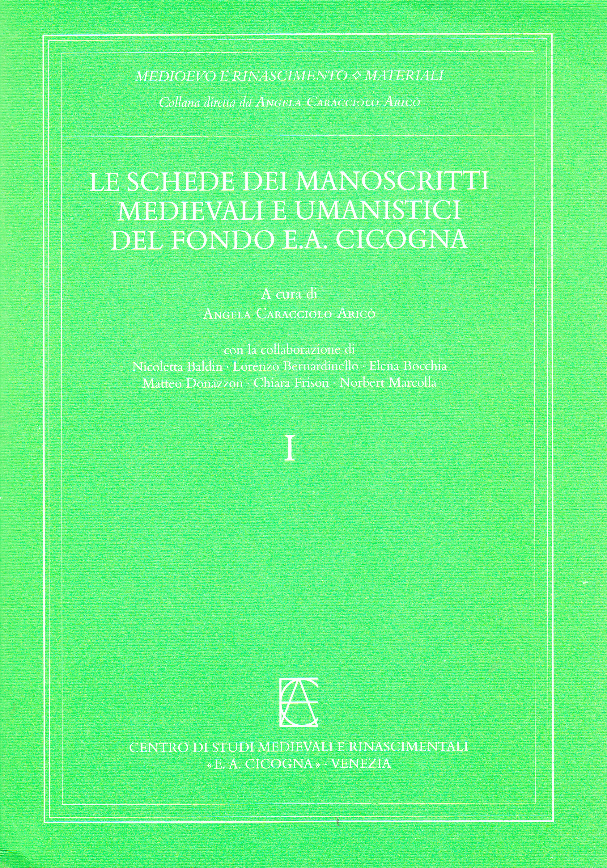 Il primo tomo de Le schede dei manoscritti medievali e umanistici del fondo "E.A.Cicogna" a cura di Angela Caracciolo Aricò contiene le schede medievali e umanistiche dei voll. I, II, IV, VI del Catalogo; il secondo volume le schede dei voll. III, V, VII, cui si aggiunge l'indice dei nomi e la bibliografia.