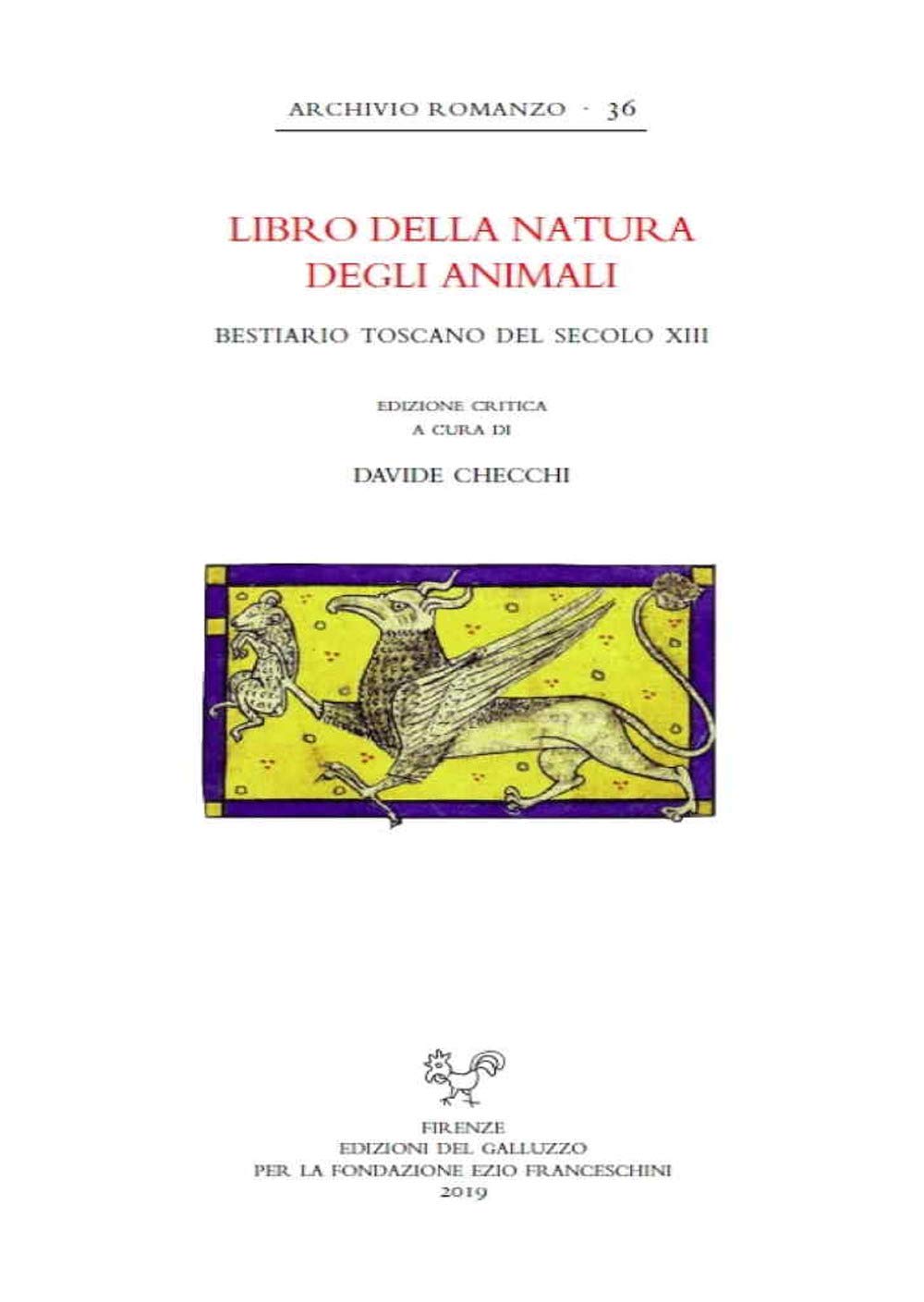 Il Libro della natura degli animali (noto anche come Bestiario toscano) è il primo bestiario moralizzato in prosa della letteratura italiana. Composto nell'ultimo quarto del XIII impiegando fonti latine e francesi, questo testo fu copiato fino alla fine del XV secolo ed ebbe una notevole diffusione nell'area toscana, nell'Italia settentrionale e in Catalogna, dove fu tradotto in catalano nella prima metà del XIV secolo. Il presente volume ne offre un'edizione critica, per la prima volta fondata su un'analisi completa della tradizione diretta e indiretta.