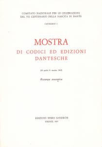 Le 400 minuziose schede bibliografiche descrivono tutti gli esemplari esposti nella mostra fiorentina – provenienti da biblioteche e collezioni di ogni parte d'Italia –, fra i quali vi sono alcune fra le più importanti testimonianze manoscritte e a stampa delle opere dantesche. In appendice, 26 tavole fuori testo in carta patinata che riproducono pagine appartenenti ai documenti più significativi e preziosi.