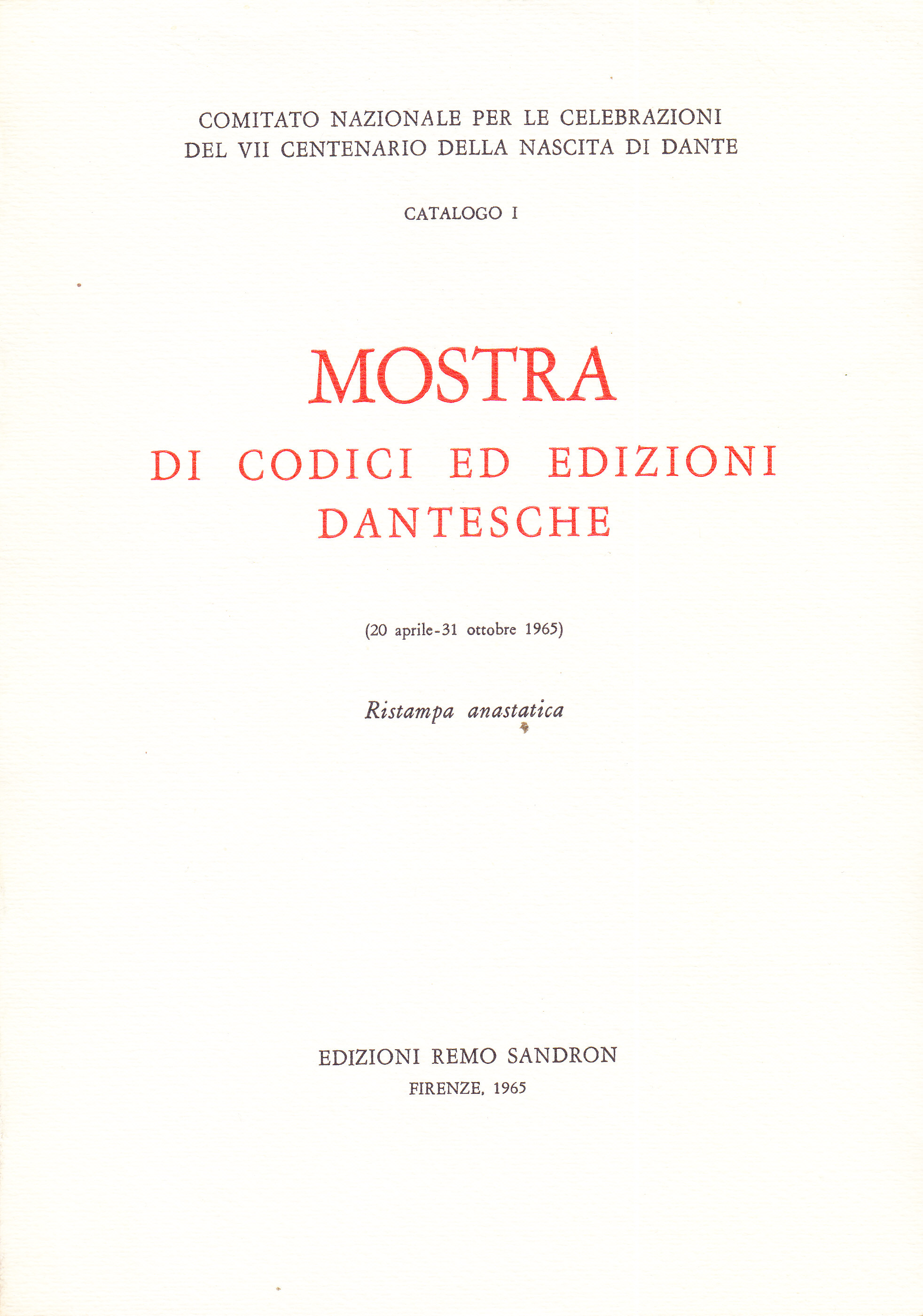 Il volume – disponibile nella ristampa anastatica del 1971 – costituisce il catalogo della mostra di materiale bibliografico "dantesco" (codici ed edizioni a stampa delle opere, esemplari dei libri costituenti una simbolica "biblioteca di Dante", testimonianze della presenza di Dante nella nostra cultura, traduzioni nelle varie lingue e in alcuni dialetti italiani, saggi e commenti) tenutasi a Firenze dal 20 aprile al 31 ottobre 1965 in occasione delle celebrazioni dell'ultimo centenario dantesco.