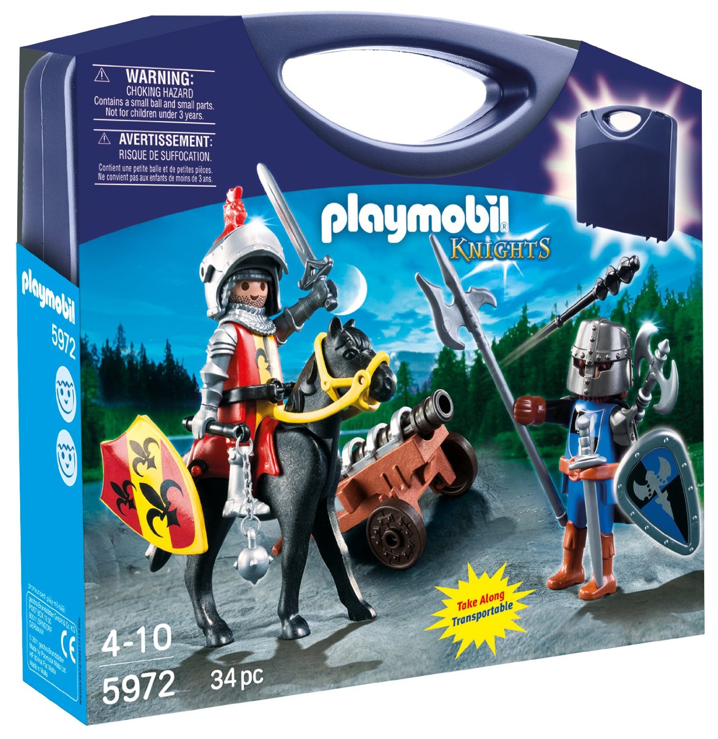 Divertiti anche in viaggio con la Valigetta Dragoni Playmobil! Contiene Cavaliere, fante a cavallo, cannone e tanti accessori. Finito di giocare - funziona da comodo contenitore per i giochi Playmobil.