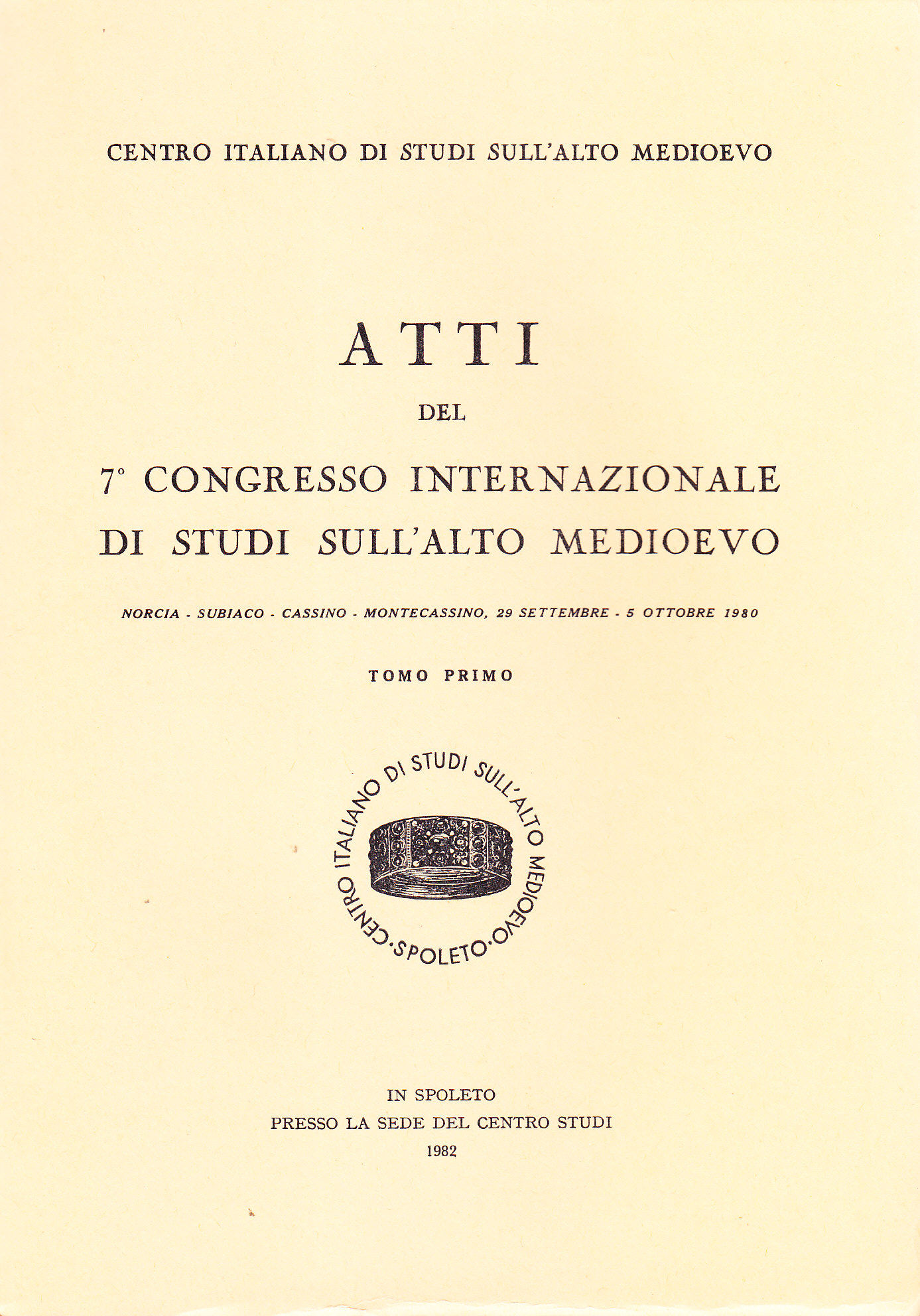 Atti del 7° Congresso Internazionale di Studi sull'Alto Medioevo (Norcia - Subiaco - Cassino - Montecassino, 29 settembre - 5 ottobre 1980)