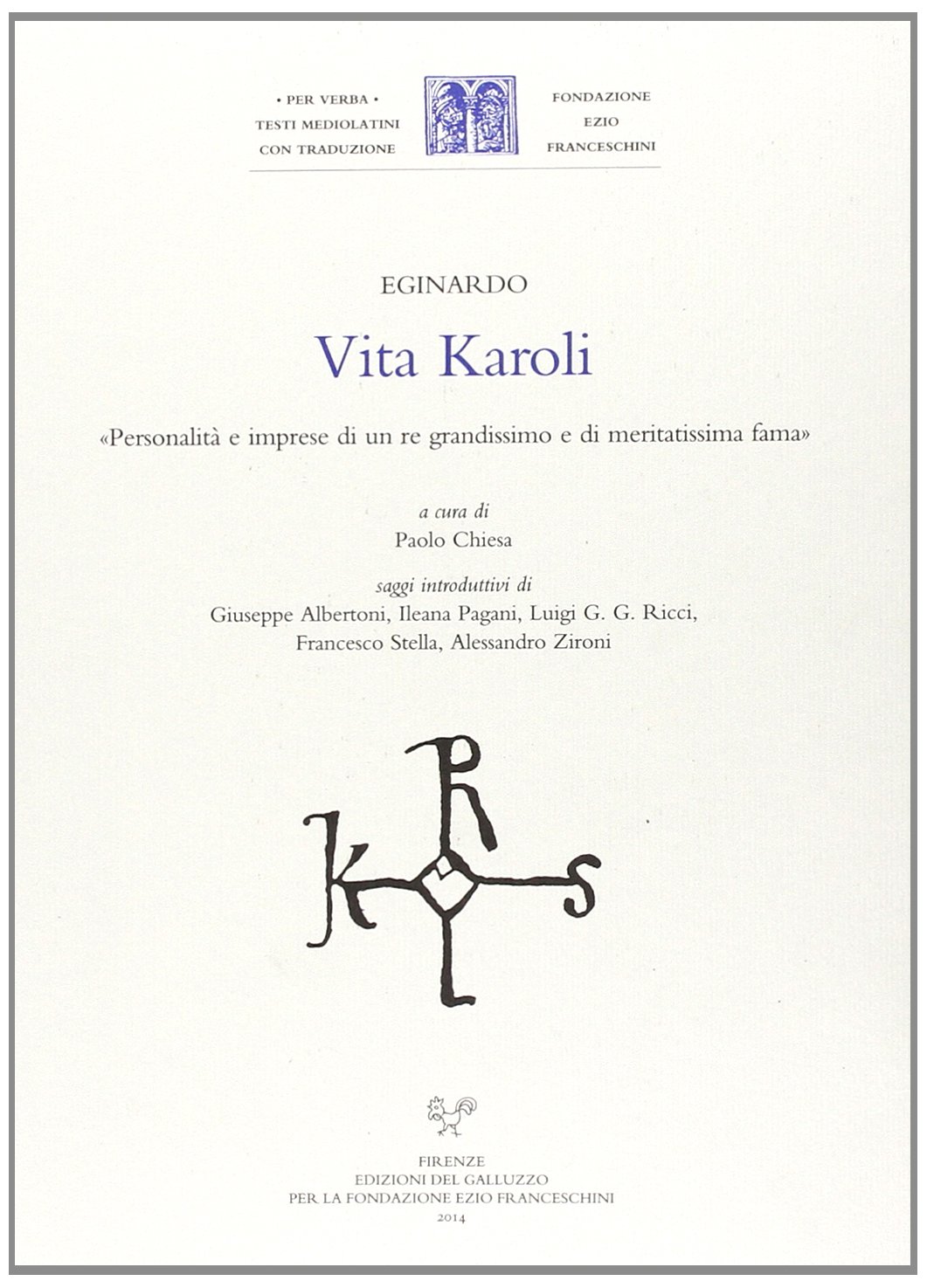 La Vita di Carlo Magno di Eginardo (770 ca. - 840) è una delle opere più famose della letteratura latina del Medioevo. Il suo autore, fra i massimi intellettuali del tempo, costruisce una biografia sorprendente per eleganza e consapevolezza di scrittura, e insieme abile nella rappresentazione del suo sovrano. L'opera è proposta qui con traduzione a fronte e commento, e con saggi introduttivi di Giuseppe Albertoni, Ileana Pagani, Luigi G. G. Ricci, Francesco Stella, Alessandro Zironi